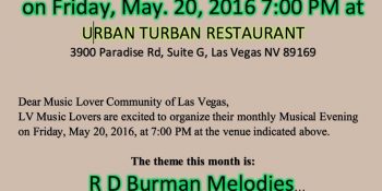 Las Vegas Music Lovers Group invites the Indian Bollywood music aficionados for a magical evening of R D Burman immortal melodies on Friday, May 20th 2016 at Urban Turban Restaurant…