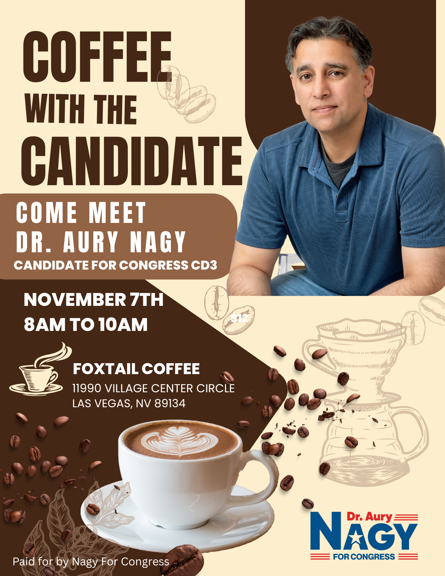 Dr. Aury Nagy, a respected Las Vegas neurosurgeon and candidate for Congress in Nevada’s 3rd Congressional District, invites community members to join him for Coffee, Conversations, and Commitment – an open and engaging discussion about the future of Southern Nevada.
