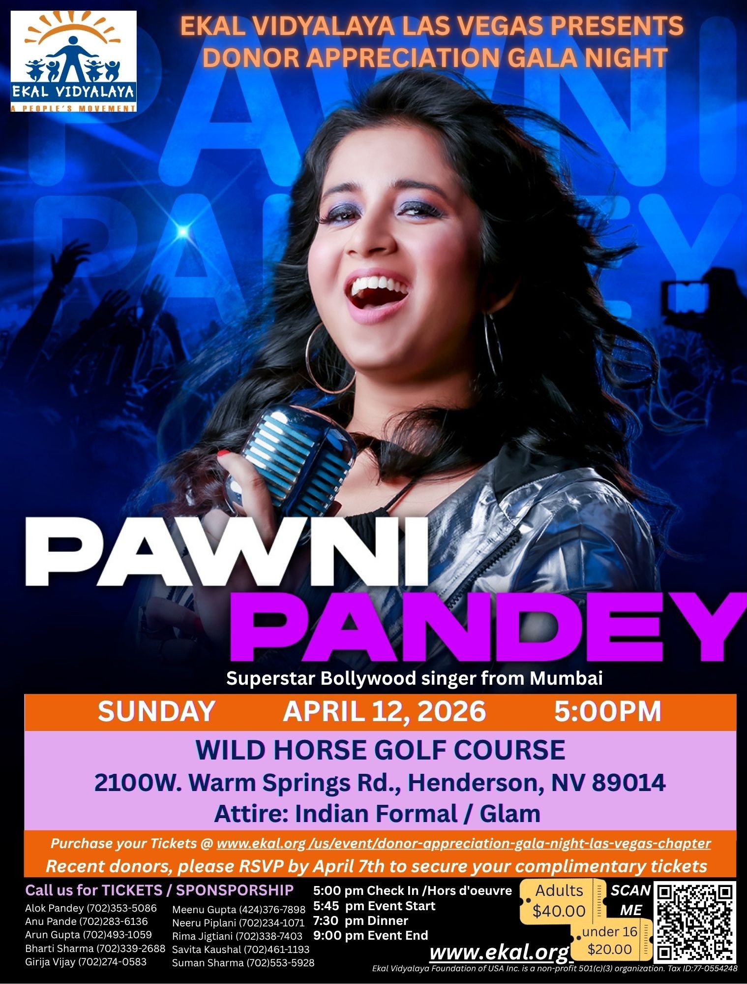 This year, Ekal Las Vegas is inviting Pawni Pandey, a Bollywood playback singer, for the evening entertainment, followed by a dinner.