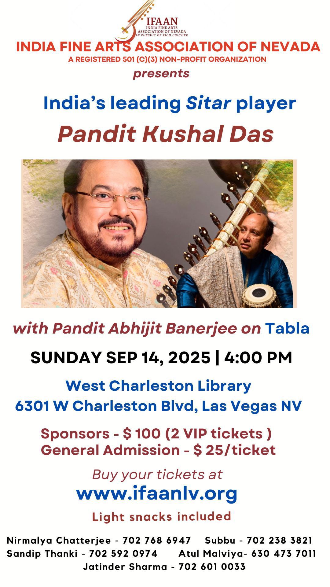India Fine Arts Association of Nevada (IFAAN) proudly announces an evening of Indian classical music with a well-known Sitar player, Pandit Kushal Das from India, along with Abhijit Banerjee on Tabla.