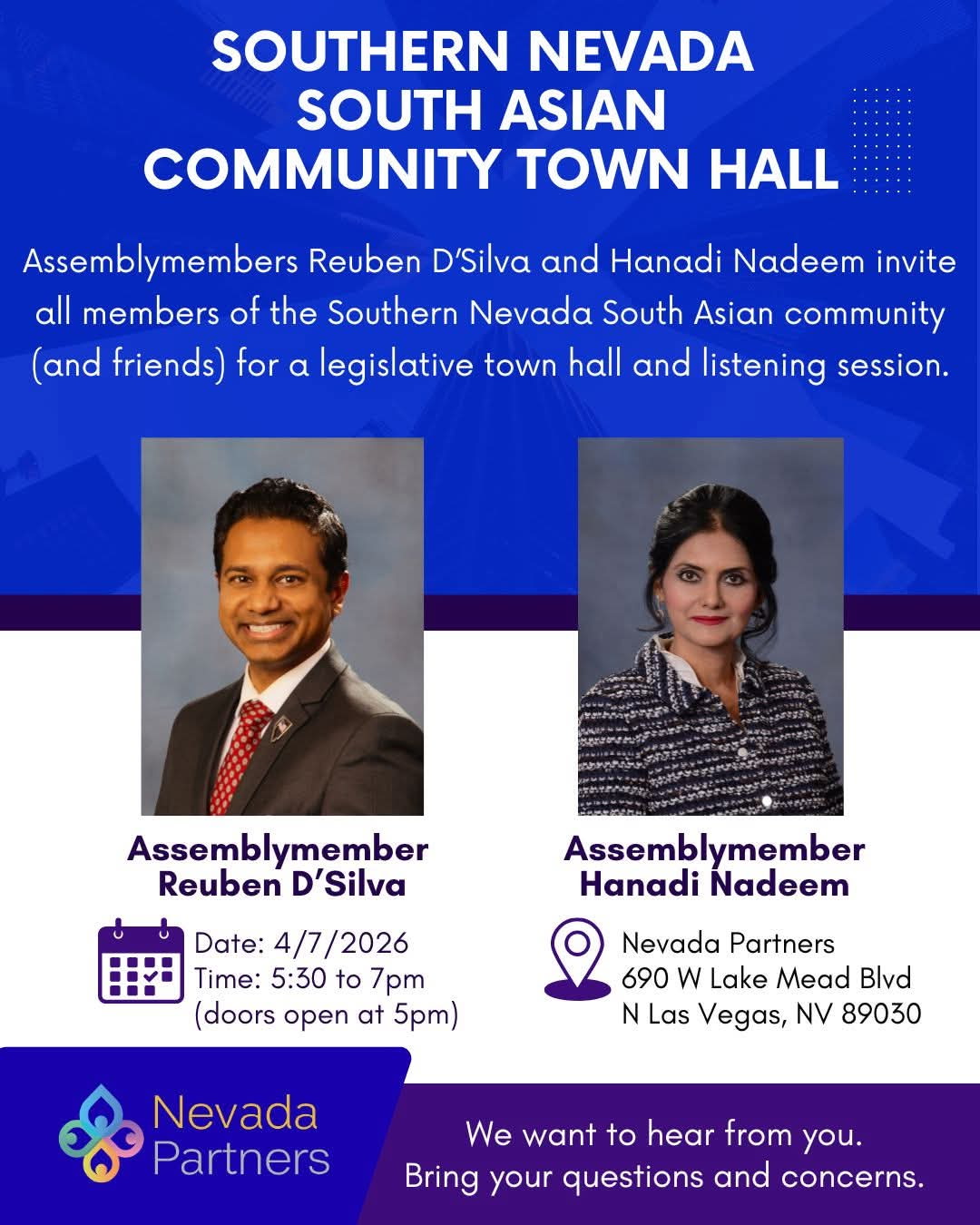 Nevada State Assemblymembers Reuben D’Silva and Hanadi Nadeem are inviting members of the South Asian community to participate in an upcoming town hall meeting aimed at fostering dialogue and civic engagement.