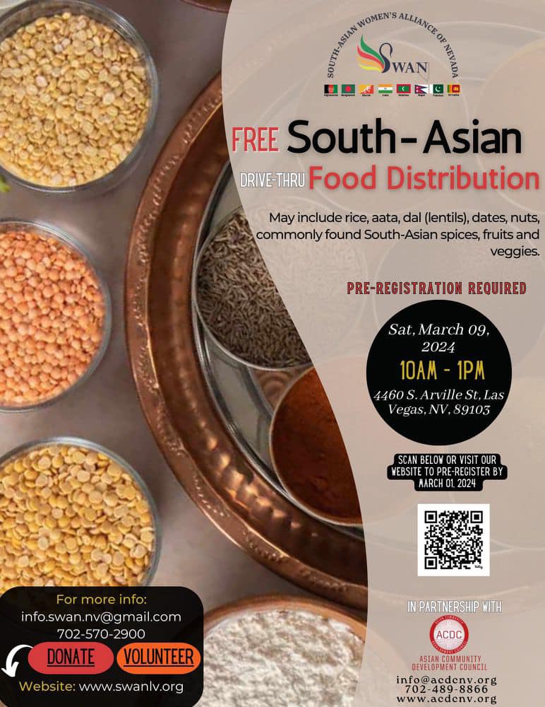 Food Distribution Event: In partnership with Asian Community Development Council (ACDC) SWAN will host a Food Distribution Event on March 9th at 9 AM, at 4460 S. Arville St, Las Vegas, NV., where volunteers will distribute South Asian-centric groceries to families in need. For more information please visit, www.swanlv.org. To secure your spot pre-register by March 1st at https://bit.ly/494CVDL to collect your food box.